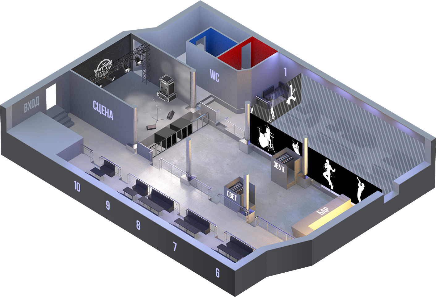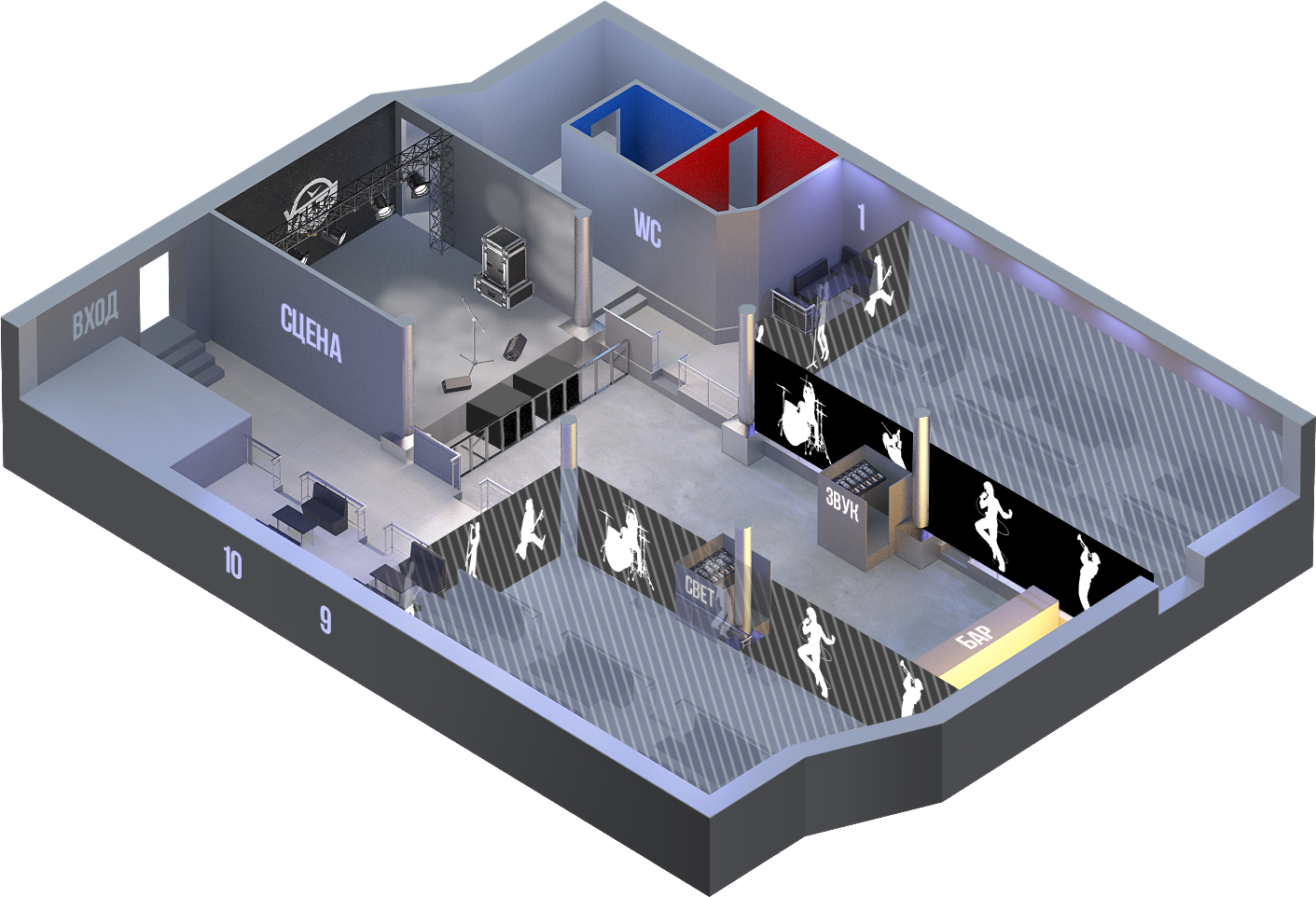 С организацией вип-зоны (доступный 1, 9, 10 столы ) вместимость до 250 - 300 человек ( общее количество мест за столиками – до 15 человек). В стоимость аренды зала включено стационарное световое и звуковое оборудование и его обслуживание, опытный персонал и вежливая охрана.