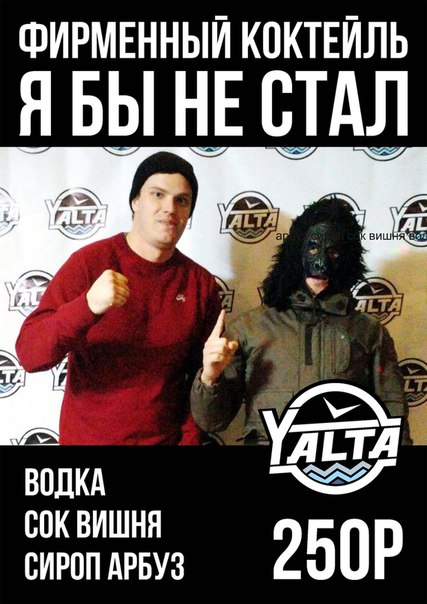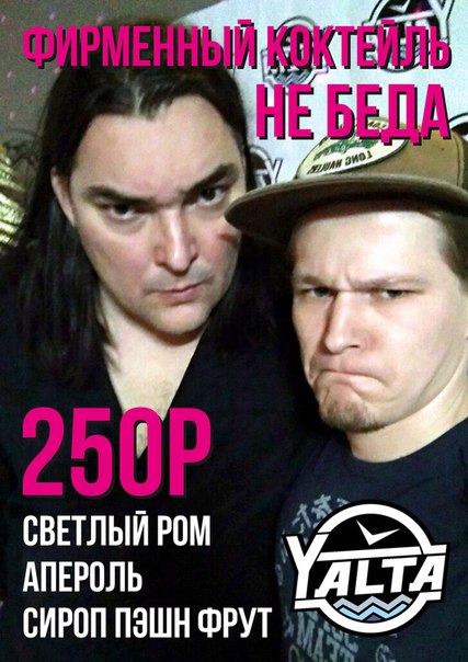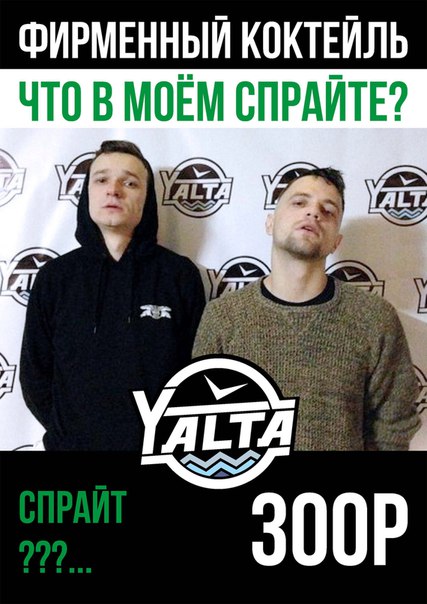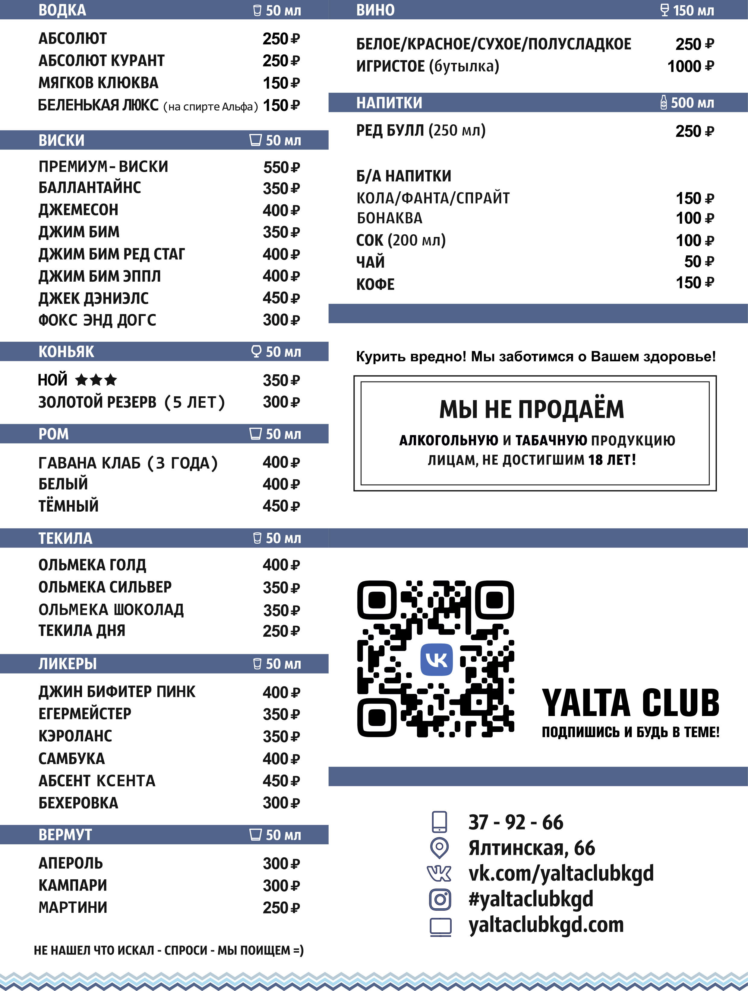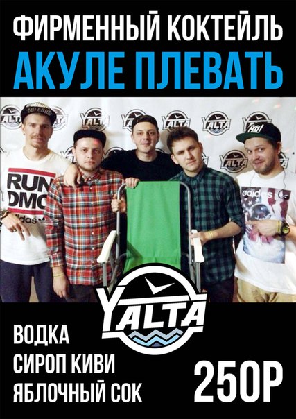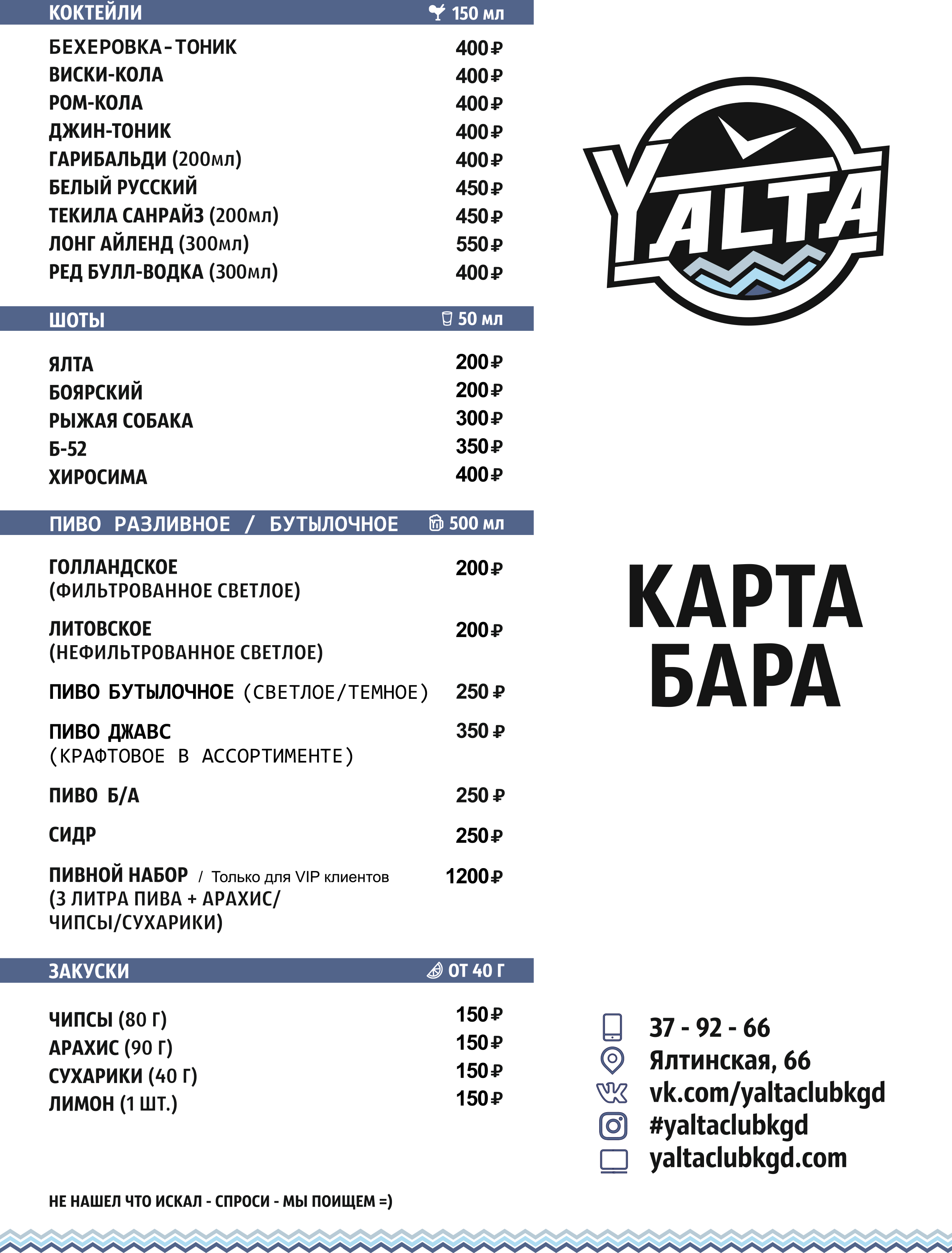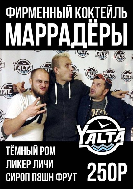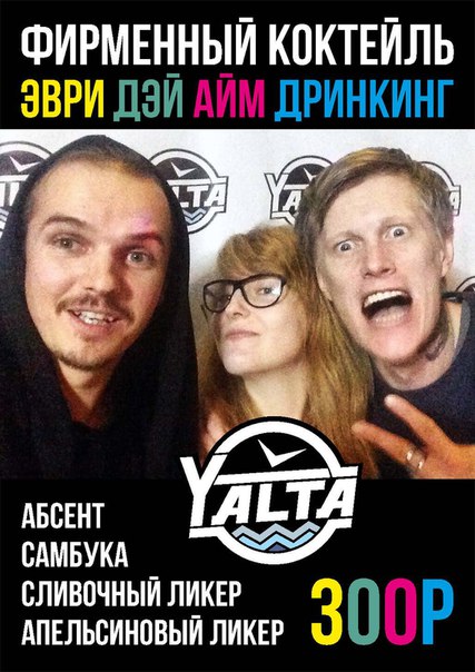 В баре клуба Yalta вы можете найти напиток на абсолютно любой вкус и даже заказать коктейль по вашему собственному рецепту – наши бармены с удовольствием вам его приготовят. С открытия клуба сложилась традиция создавать коктейль в честь мероприятия, которое проходит в этот день. Так, например, Вы можете выпить коктейль «Гантеля», который наши гости пробовали на концерте группы «Кровосток», или «Мандариновый бум», пользовавшийся большой популярностью на Новогоднем корпоративе.